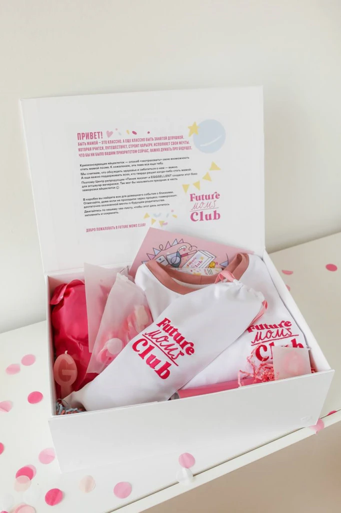 Мы создали особый набор для вечеринки в честь криоконсервации ооцитов и решения стать мамой — эггшауэр-бокс. Бокс получился блестящим, праздничным и радостным — внутри гирлянда, безалкогольное игристое, наша авторская карточная игра-болталка про осознанное родительство (!!!), фирменный мерч Future Moms Club, основы для коктейлей и другие приятности.